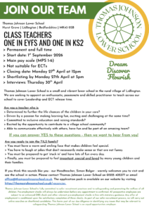 We are currently looking to appoint two class teachers – one in EYFS and one in Key Stage 2 – to join our team from September 2026.